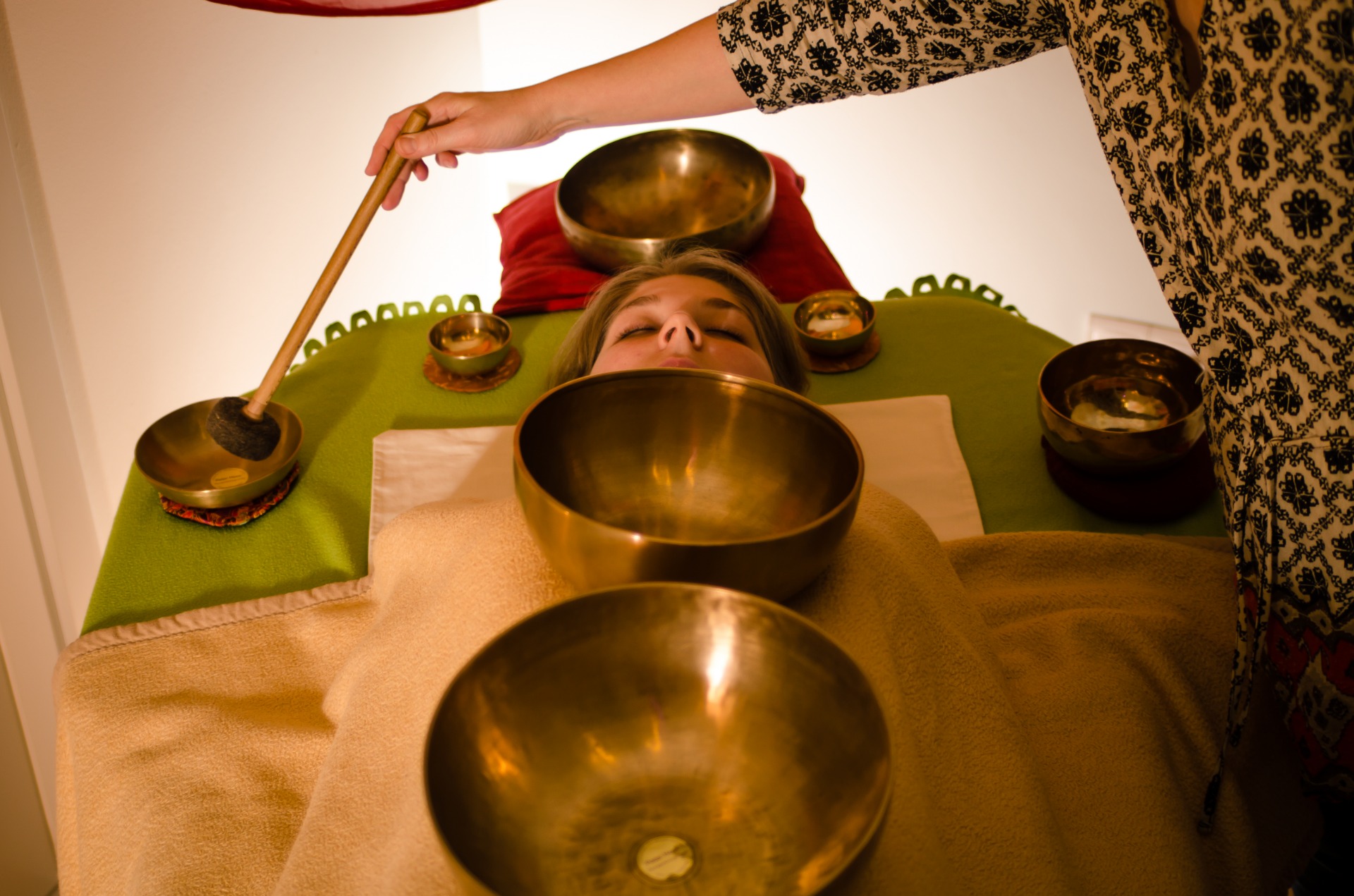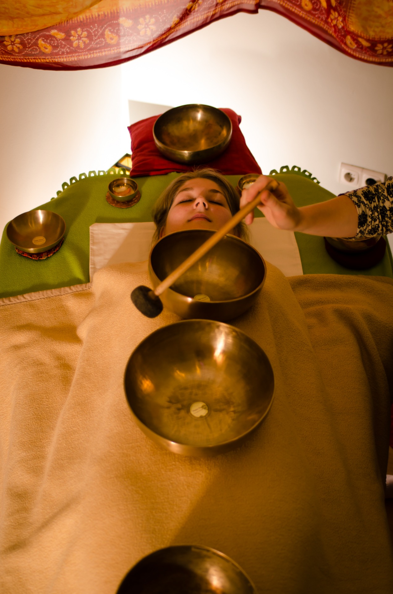 Miután megérkeztél, egy rövid beszélgetés után megkérlek, hogy helyezkedj el a masszázságyon (ha a fekvés nehézséget okoz, akkor egy széken). A hangmasszázshoz célszerű kényelmes ruhát felvenni, ami nem zavar, vagy akadályoz a fekvésben. Ha igényled és fázós vagy, akkor egy puha pléddel betakarlak, mert fontos, hogy a kezelés alatt ne fázz, hogy teljes figyelmeddel tudj magadra és az aktuális belső folyamatodra koncentrálni. Ezután tested egyes pontjaira és köré különböző méretű tálakat helyezek, melyeket filc ütővel lágyan megütök.